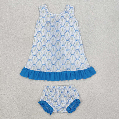 Baby Girls Blue Bows Flowers Tunic Bummie Clothes Sets