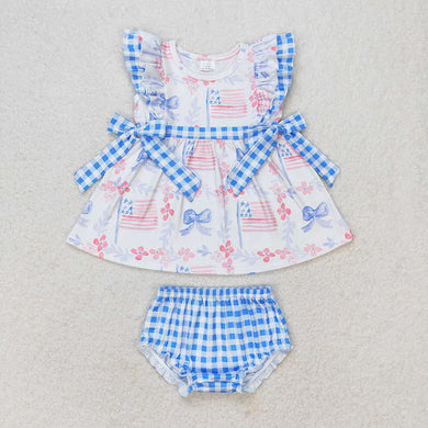 Baby Girls Blue Bows Flag Top Ruffle Shorts Clothes Sets