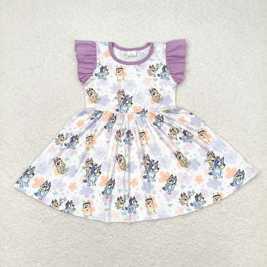 Baby Girls Blue Dogs Flowers Flutter Sleeve Knee Length Dresses