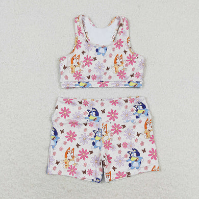 Baby Girls Blue Dog Flowers Crop Tops Shorts Clothes Sets