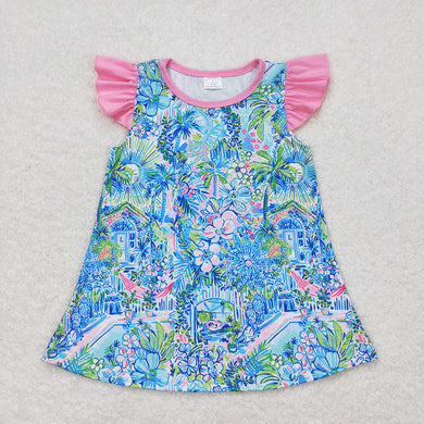 Baby Girls Blue Flowers Flutter Sleeve Knee Length Dresses