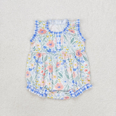Baby Girls Blue Flowers Checkered Shorts Jumpsuits