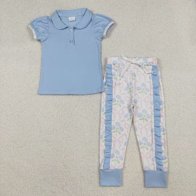 Baby Girls Blue Button Shirts Top Floral Ruffle Leggings Clothes Sets