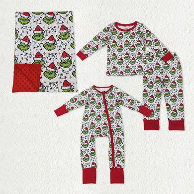 Sibling Baby Boys Green Faces Lights Christmas Pajamas Sets Zipper Footie Rompers Blankets