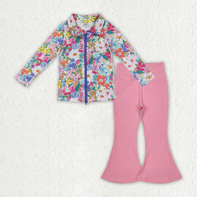 Baby Girls Floral Pockets Zipper Jackets Bell Bottom Pants Yoga Active Clothes Sets