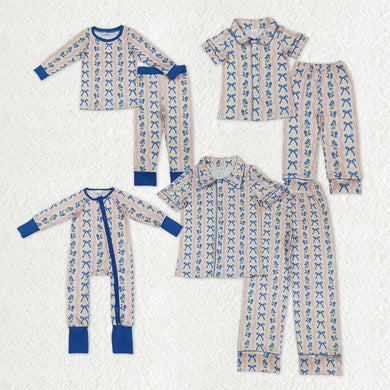 Sibling Adult Women Girls Blue Bows Flower Stripes Button Pajamas Sets Zipper Footie Rompers