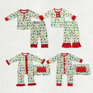 Sibling Baby Kids Green Red Trees Button Top Pants Christmas Pajamas Sets Zipper Footie Rompers
