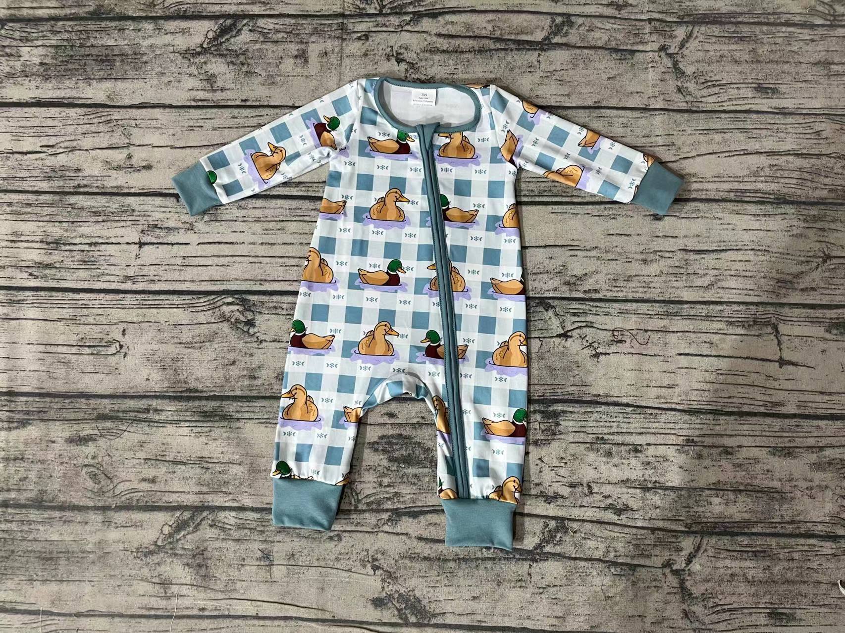 • Load image into Gallery viewer, Baby Boys Duck Blue Checkered Zip Long Sleeve Rompers