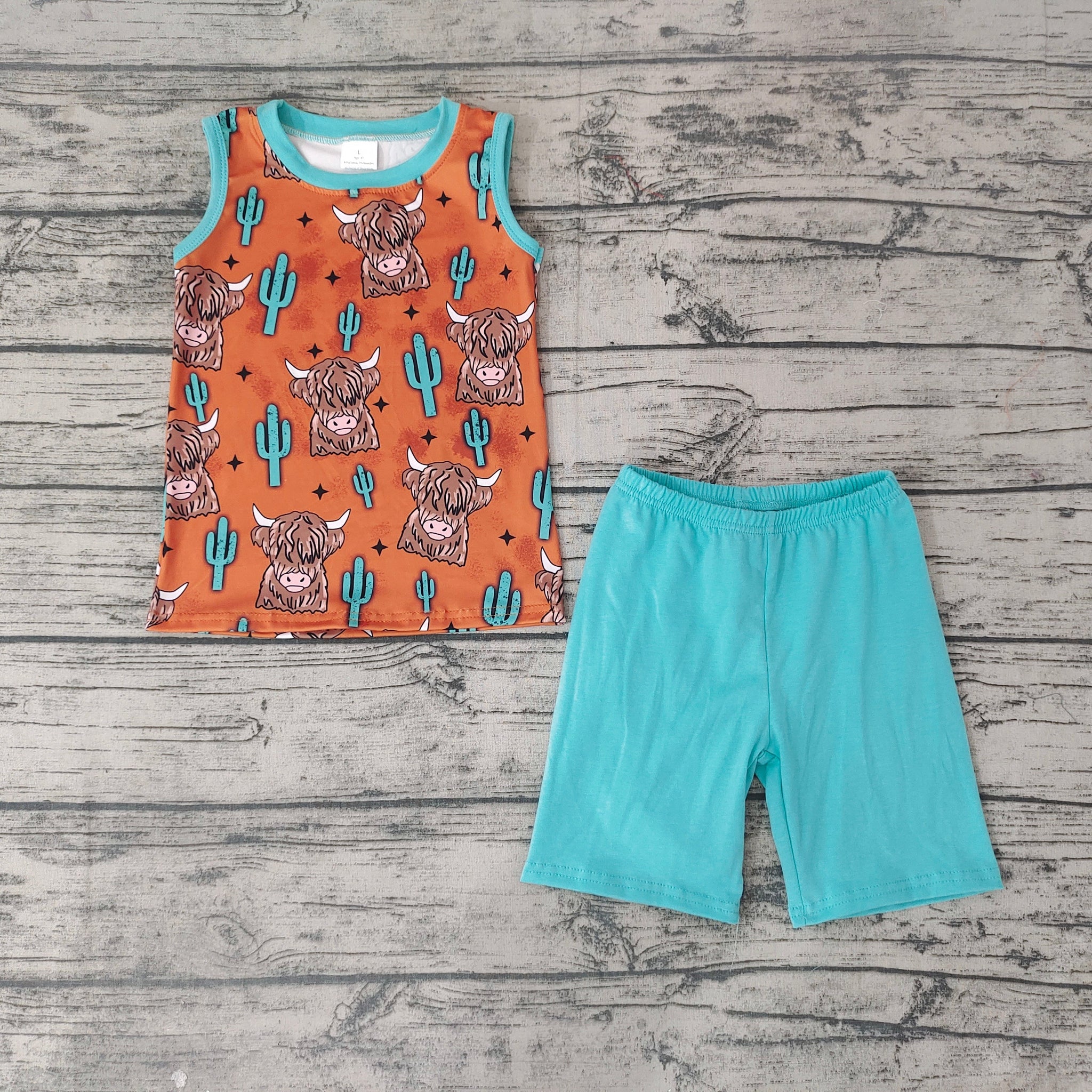 Baby Boys Western Highland Cow Sleeveless Tee Shirts Shorts Sets