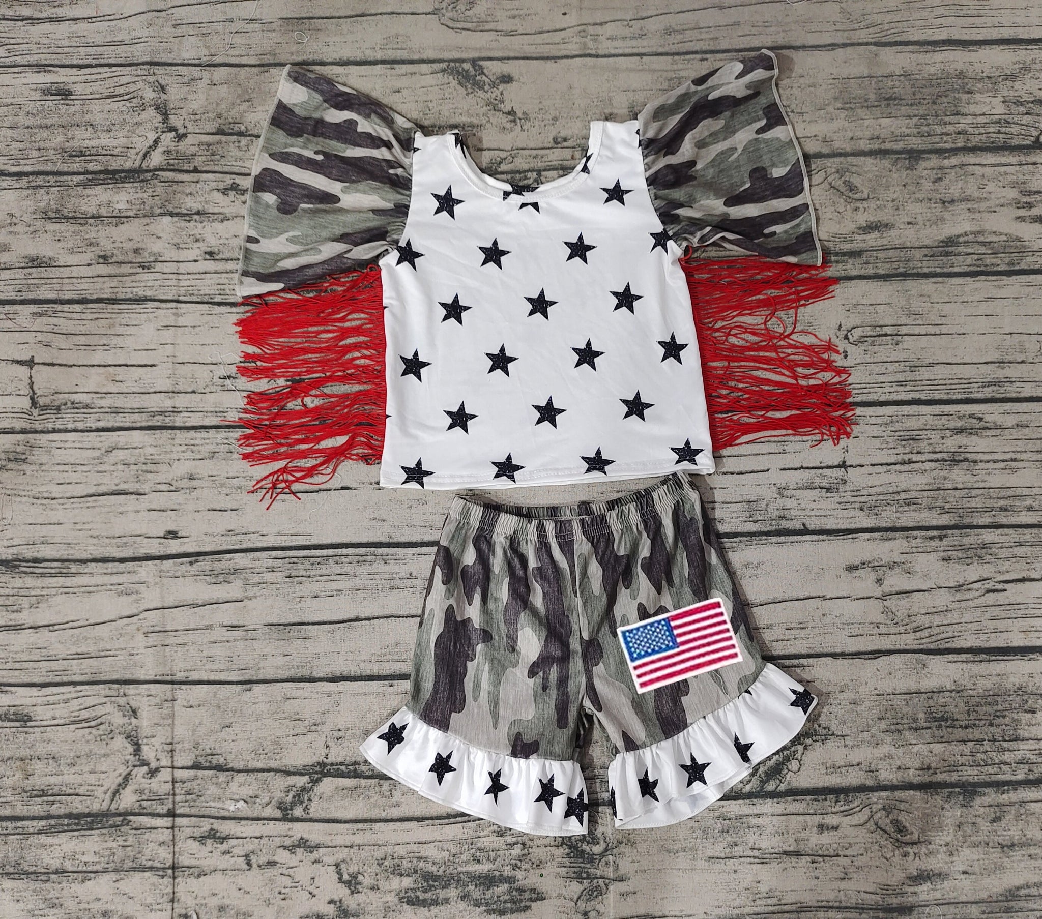 • Load image into Gallery viewer, Baby Girls 4th Of July Camo Stars Tops Ruffle Shorts Clothes Sets