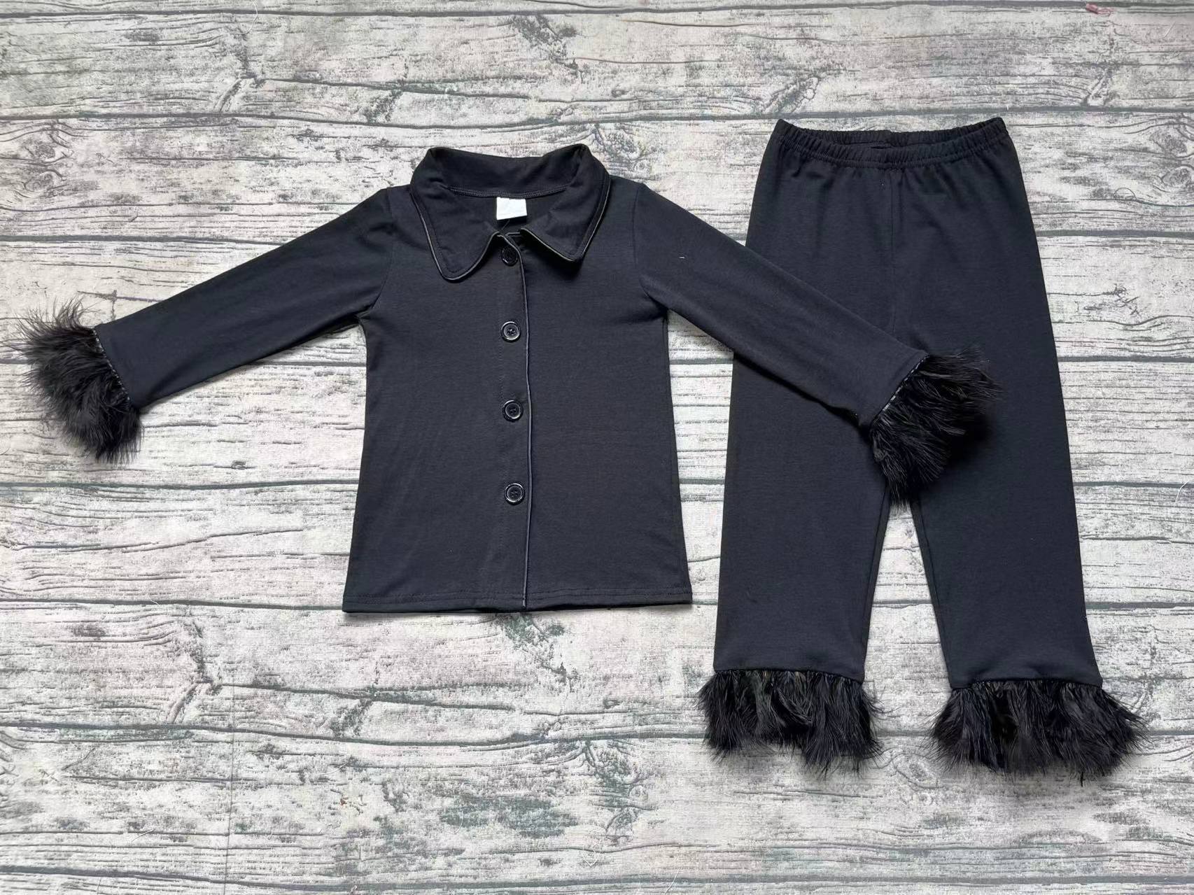 Baby Girls Black Cotton Buttons Top Pants Fur Pajamas Clothes Sets