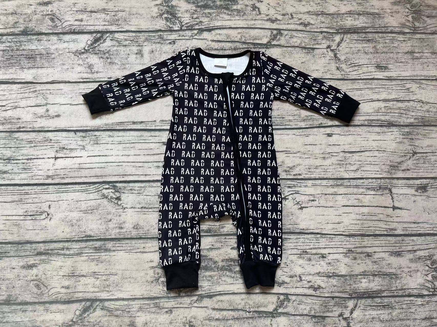 • Load image into Gallery viewer, Baby Girls Black Words Rad Long Sleeve Zip Rompers