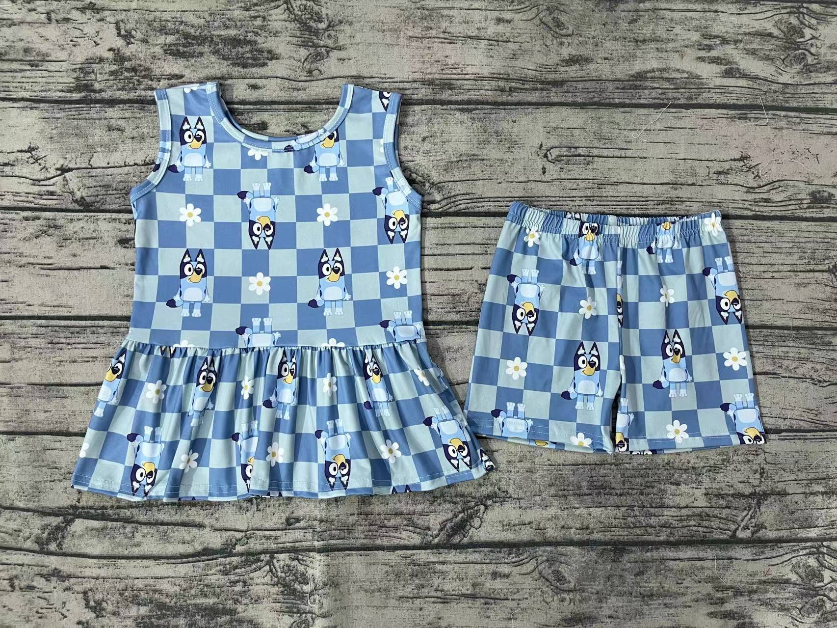 Baby Girls Blue Dogs Flowers Tunic Top Shorts Clothes Sets