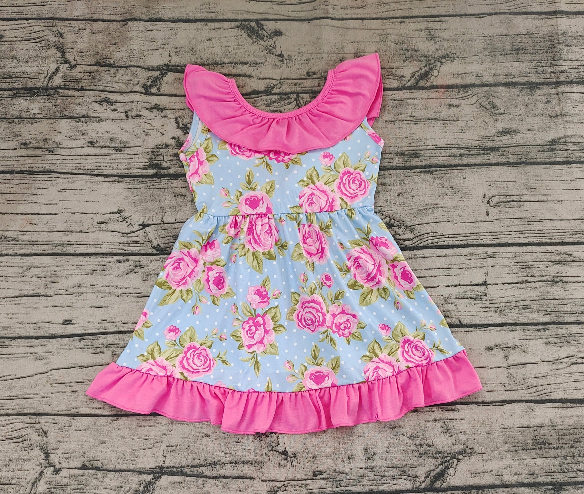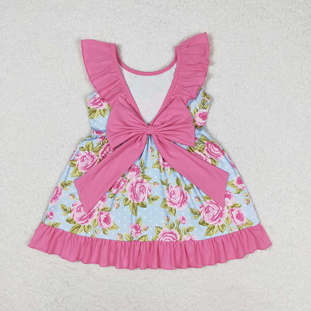 Baby Girls Blue Dots Pink Flowers Bow Knee Length Dresses