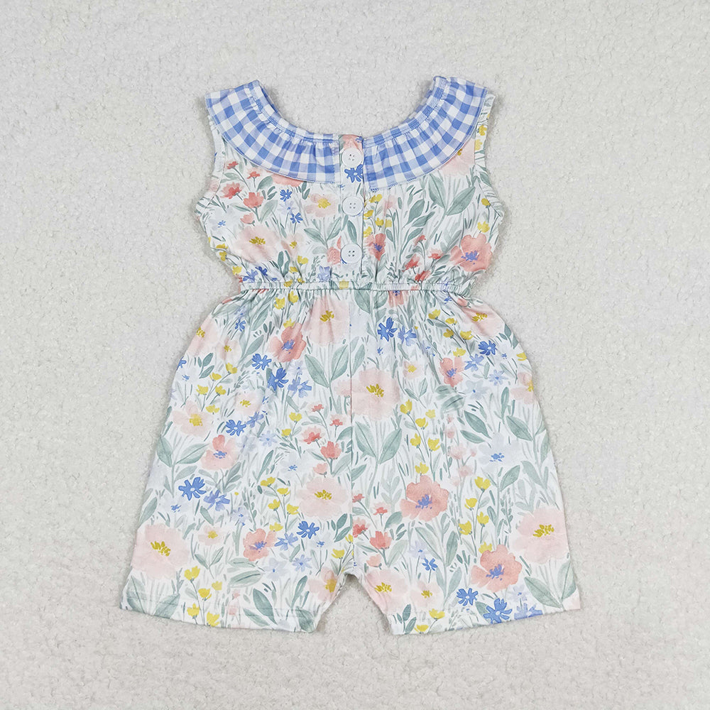 Baby Girls Blue Flowers Checkered Shorts Jumpsuits