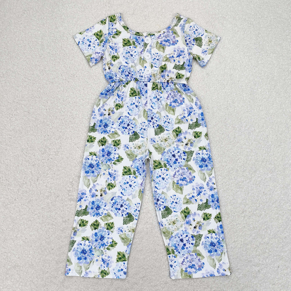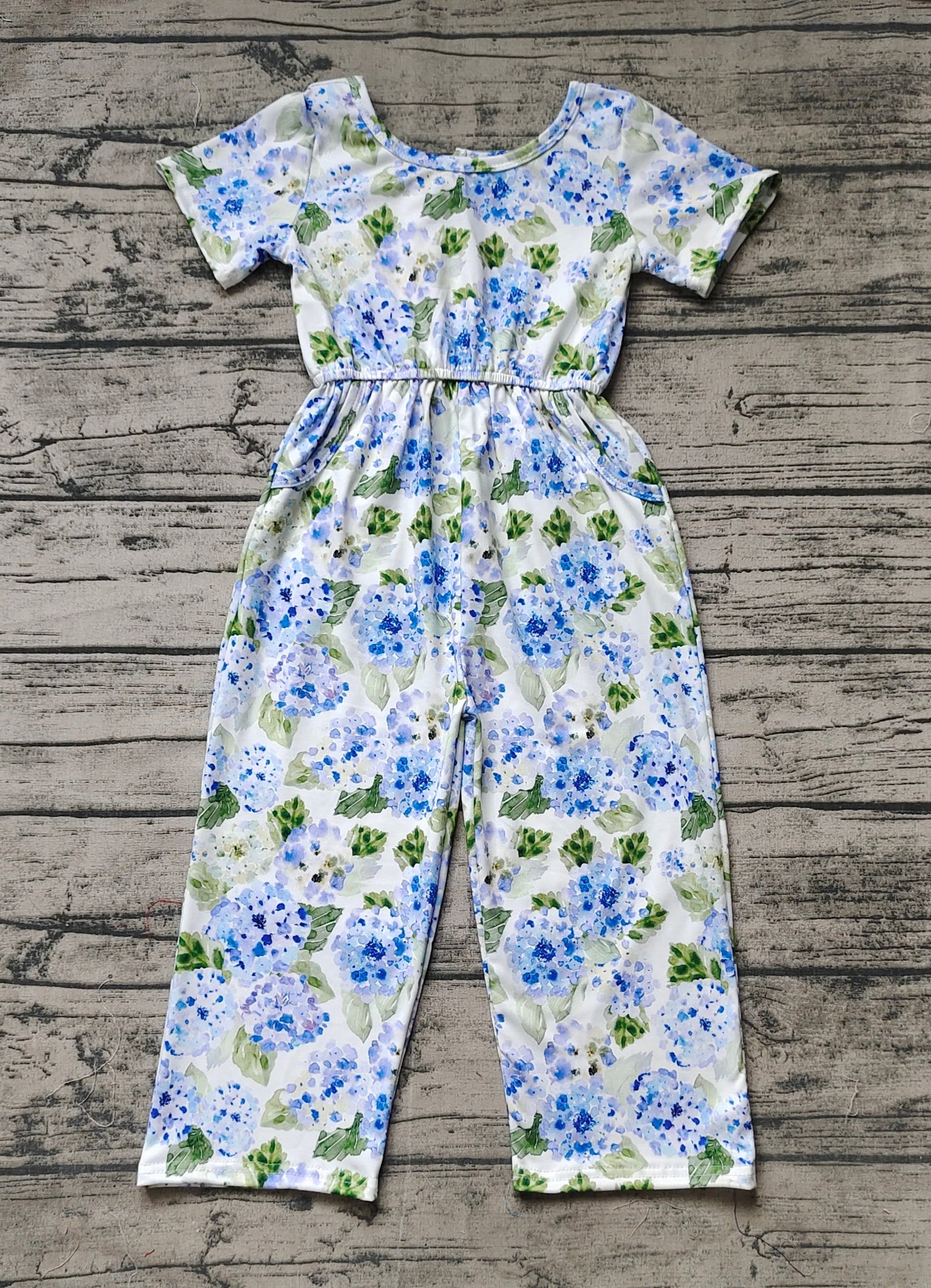Baby Girls Blue Flowers Short Sleeve Pockets Pants Jumpsuits