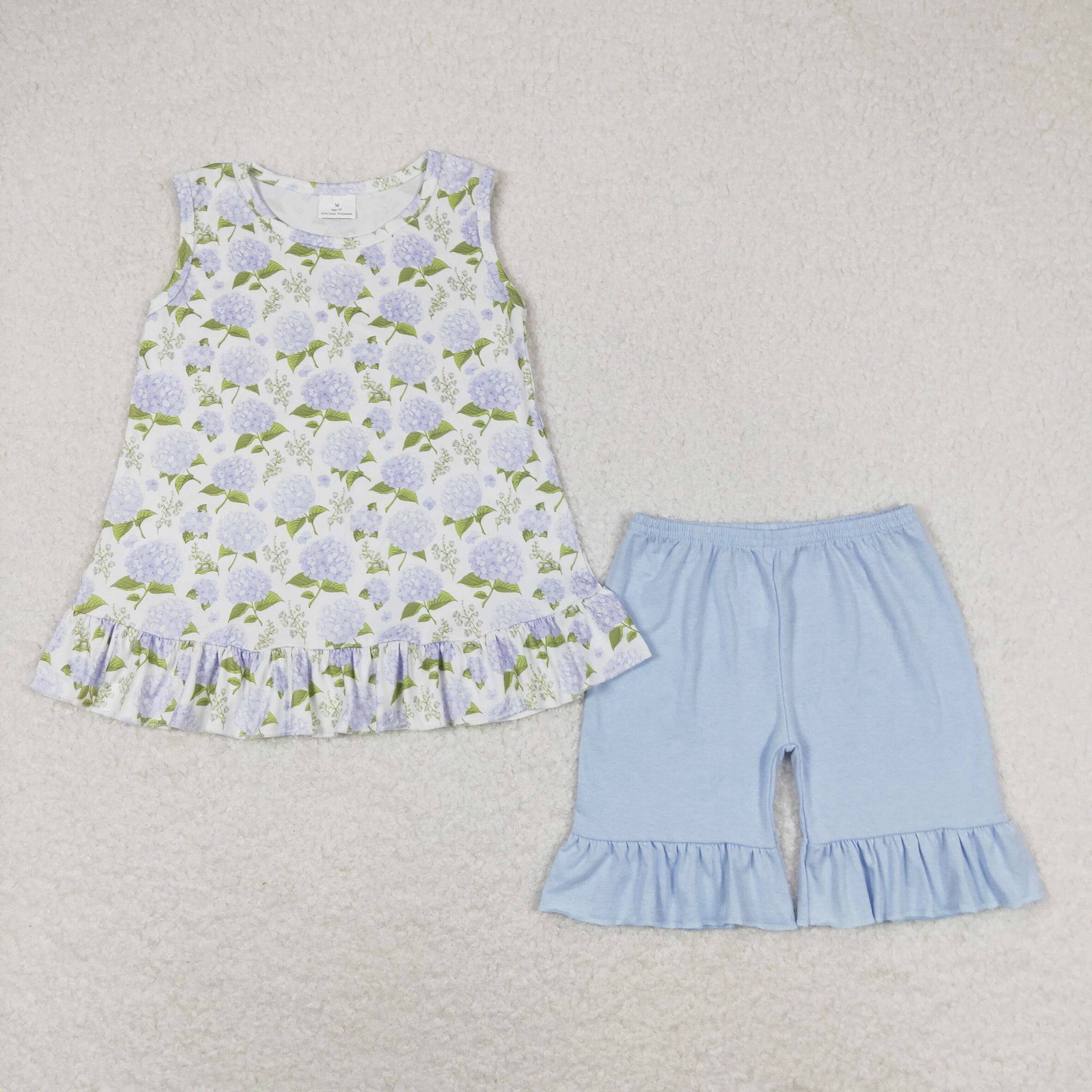 Baby Girls Blue Flowers Sleeveless Tunic Ruffle Shorts Clothes Sets