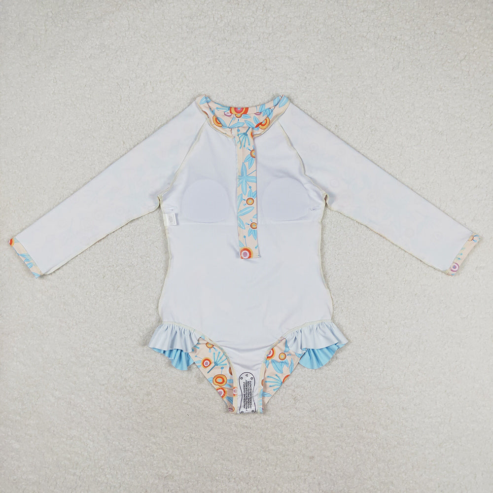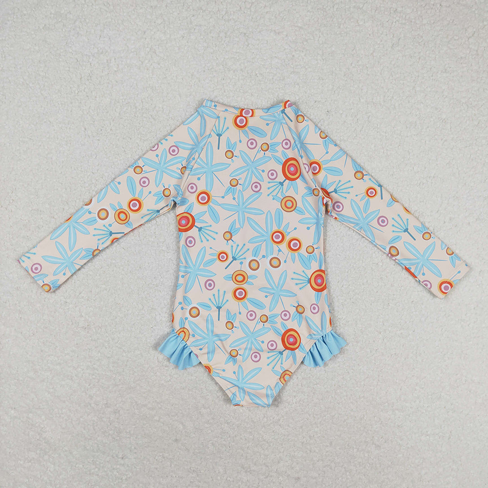 Baby Girls Blue Leaves Flowers Long Sleeve Zip Swimsuits