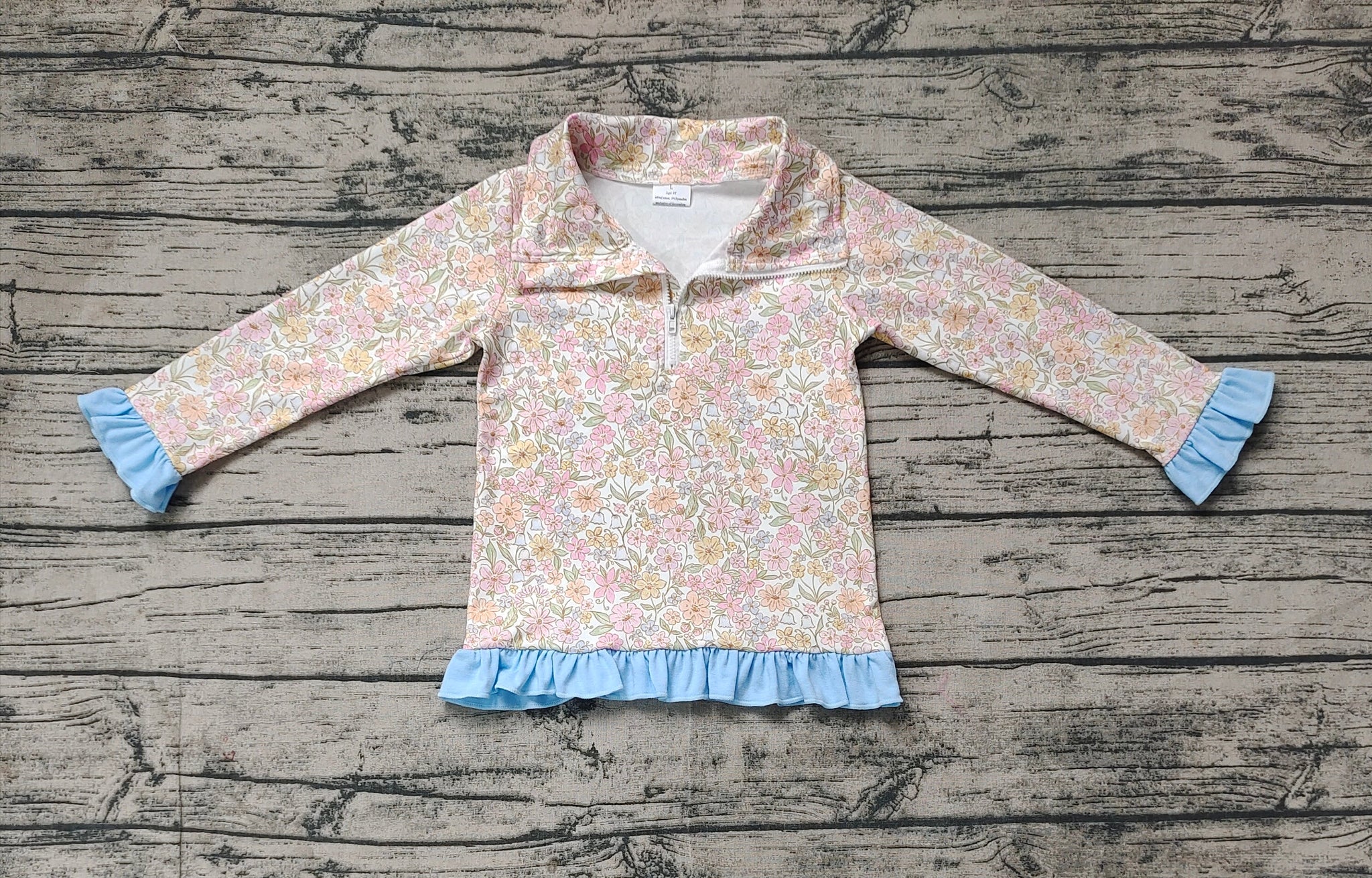 Baby Girls Blue Pink Flowers Zip Long Sleeve Pullovers Tops