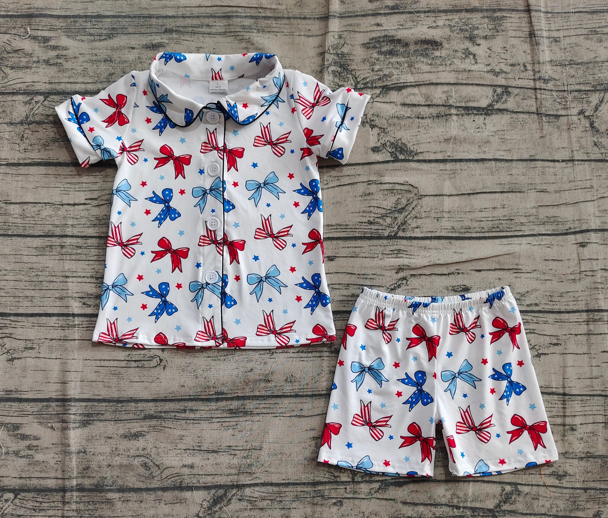 Baby Girls Blue Red Bows Button Top Short 4th Of July Pajamas Sets