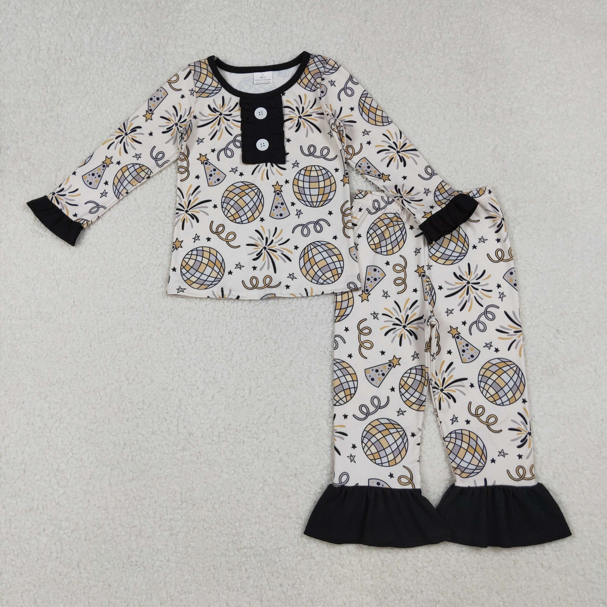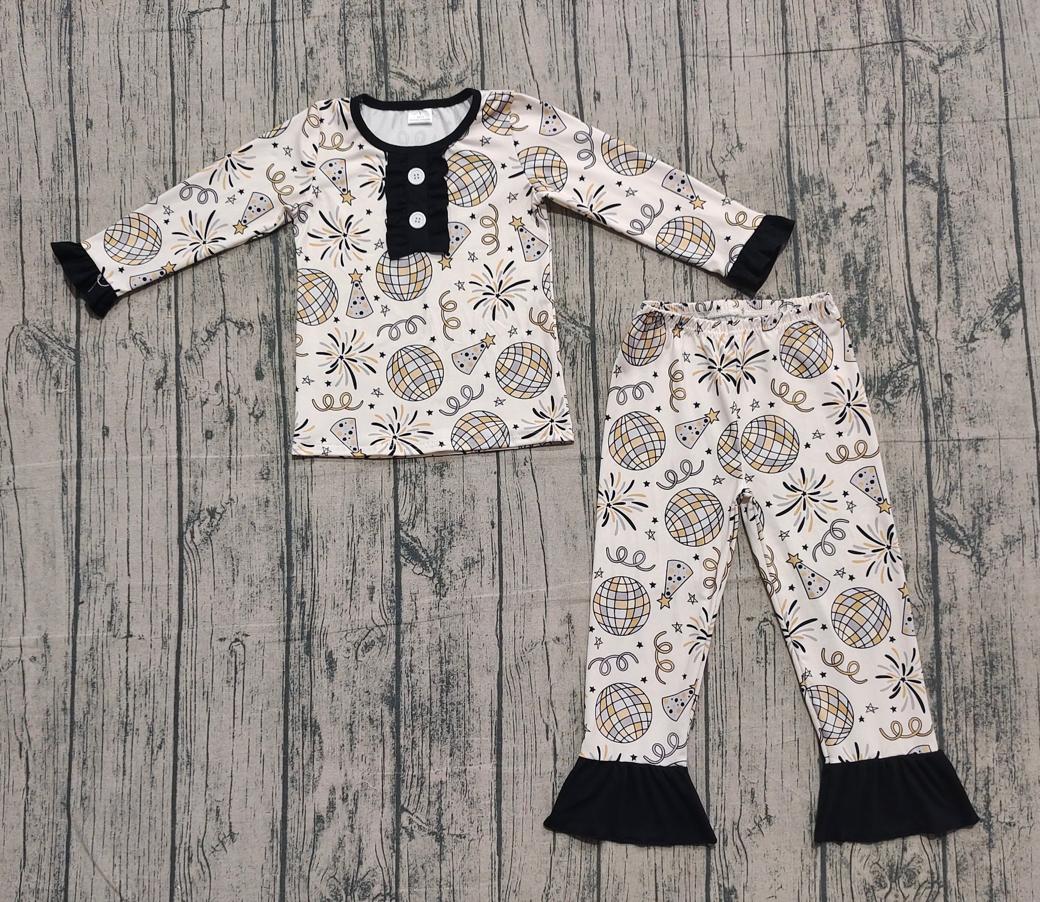 Baby Girls Happy New Year Button Top Ruffle Pant Pajamas Sets