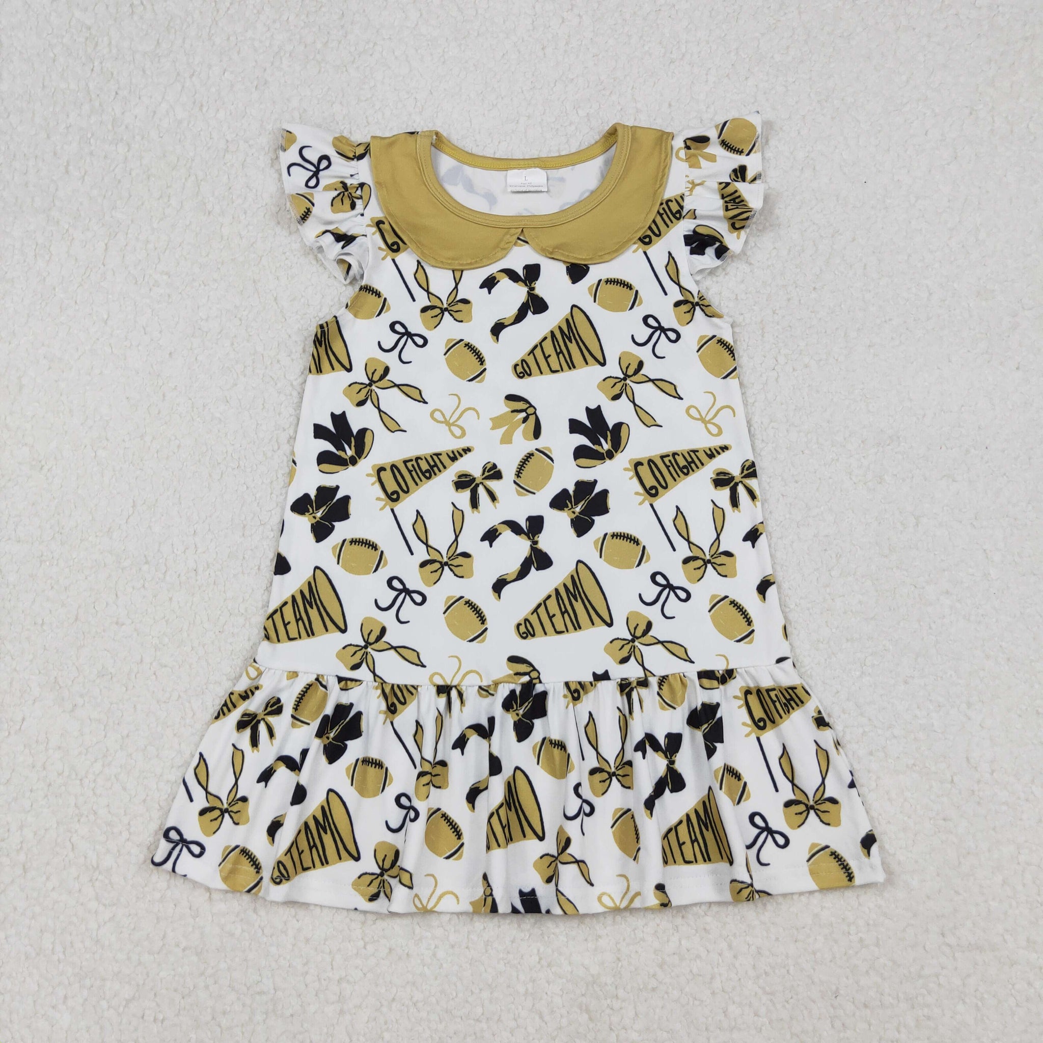 Sibling Baby Girls Gold Bows Footballs Go Team Ruffle Zipper Footie Romper Knee Length Dress